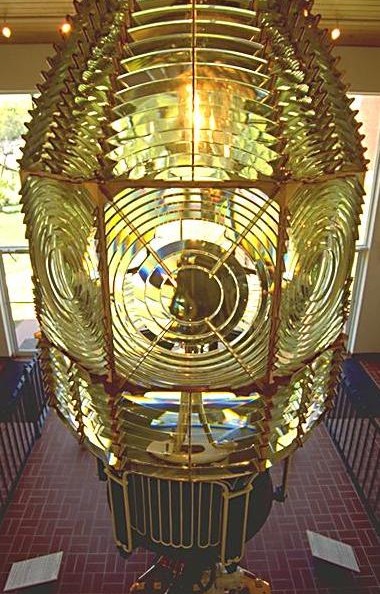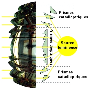 Mais la grande révolution fut l'invention, par Augustin Fresnel, des lentilles de verre à échelons ; la première lentille fut construite en 1821, d'abord polygonale puis à anneaux circulaires. Un ensemble de telles lentilles fut installé pour la première fois au phare de Cordouan, en juillet 1823, après un essai sur l'arc de triomphe de l'Etoile, à Paris.Le premier appareillage de Cordouan était conçu de telle façon que les rayons lumineux émis vers le haut étaient diffusés au travers de lentilles placées au-dessus de la source, puis renvoyés vers l'horizon grâce à un système de miroirs situés au-dessus de ces lentilles. Cette combinaison de lentilles et de miroirs était fort encombrante. L'invention par le même Fresnel des anneaux catadioptriques permit de résoudre ce problème en installant de tels anneaux au-dessous et au-dessus des anneaux dioptriques de la lentille à échelons.